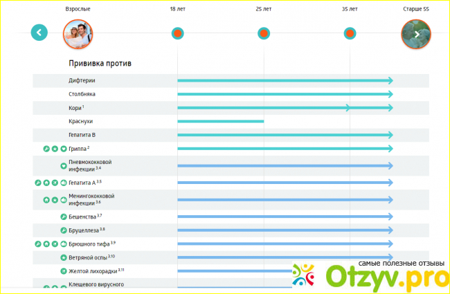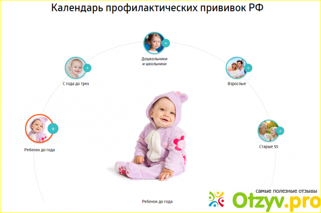Для этого на сайте есть очень удобная схема, на которой указаны люди от рождения и старше 55 лет, кликаешь на тот или иной "шарик" с изображением своего возраста или возраста ребенка и вот, пожалуйста, календарь прививок перед вами.