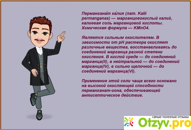 Перманганат калия, или марганцовка, как часто говорят в обиходе, является веществом, которое может принести организму человека и пользу, и вред. Это кристаллическое вещество темных оттенков фиолетового цвета, которое применяют в виде раствора местно или внутрь, соблюдая назначенные врачом дозировки.
