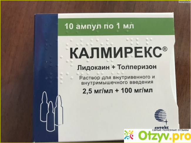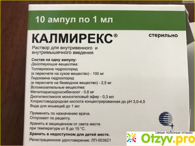 Итак, перед нами Калмирекс – в его составе содержатся два активных вещества: толперизон и лидокаин. выпускается препарат в форме раствора для внутривенного и внутримышечного введения, других видов препарата не существует.