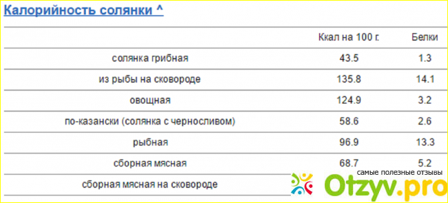 Кто же не любит солянку? Хотя есть и такие, на вкус и цвет все таки товарища нет, так что для тех, кто все же любит солянку, сообщаю, калорийность этого блюда всего 43 калории, это касается грибной, а вот некоторые виды солянки могут затянуть на высококалорийное блюдо - смотрите таблицу ниже и выбирайте, а самое главное - питайтесь правильно, чтоб организм не испытывал дефицит, и не ухудшался обмен веществ!