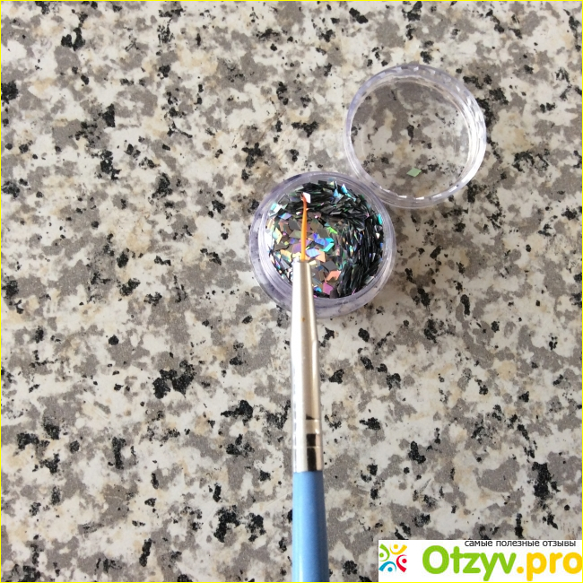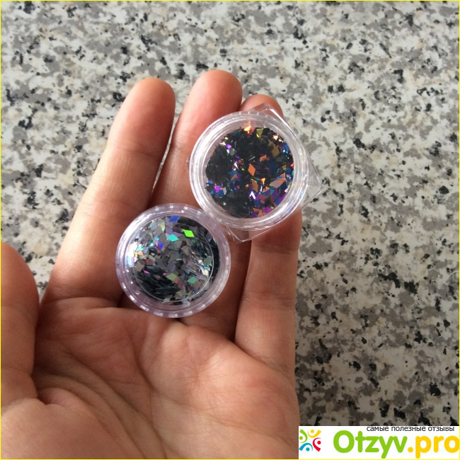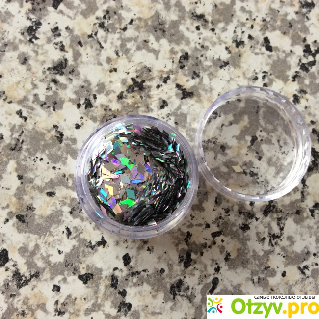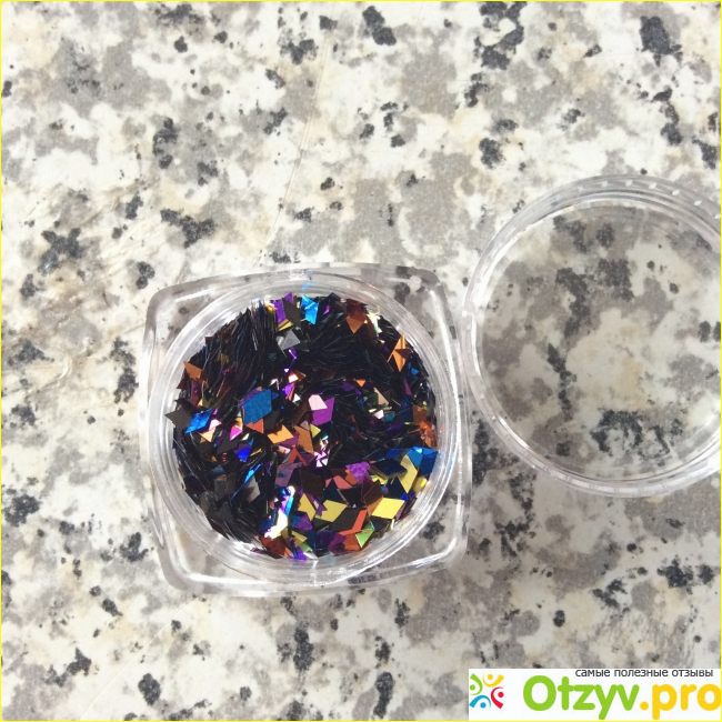Первый вариант - это более классический сдержанный цвет – металлик с отблеском как хамелеон, который прекрасно смотрится совершенно с любым оттенком гель-лакового покрытия. Количество частичек украшений в упаковке огромное количество, хватает надолго, даже с учётом постоянного использования. Такой универсальный оттенок подходит практически ко всем цветам покрытия, сочетается с другими материалами. Так же нужно отметить легкое использование. Благодаря тонкой кисти или карандашу для приклеивания страз они легко переносятся из баночки на ногтевую пластину.