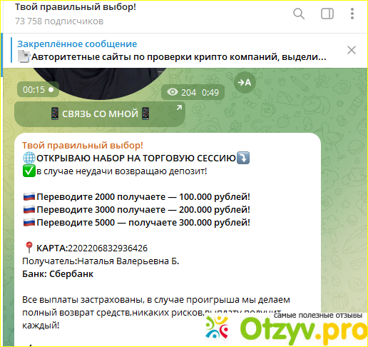 На канале невозможно написать, а только через личное сообщение. Кстати, когда человек оплатл 10000 рублей за якобы страховку, то его блокируют. Еще на канале пшут ну очень очень безграмотные люди. Что тоже выдают за мошеннчество (наверное жалко им заплатить пару сотен