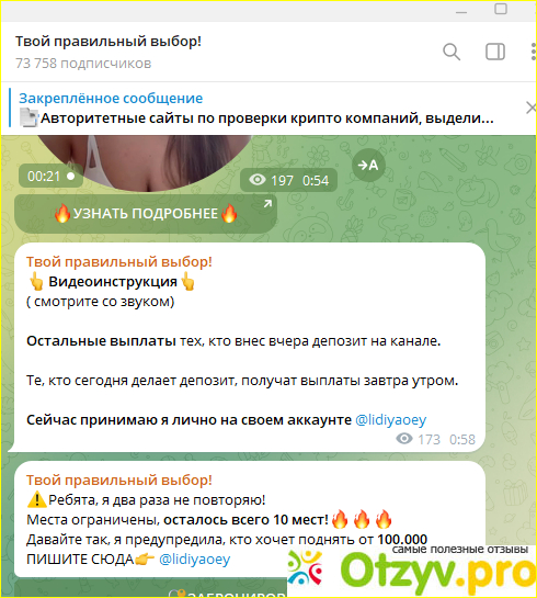 Хочу оставтить отзыв, а точнее отрицательный о канале Твой правильный выбор (несколько дней назад канал имеел такое название Лидия Мордашова). Хотя и может сменить и другое название. Только суть одна и та же - обмануть доверчивых людей.
