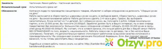 Как только я увидела все эти условия и обязанности по работе я, конечно, сразу позвонила. Мне все опять красиво рассказали. Я должна была собирать на дому шариковые ручки, а потом сообщать и по адресу должен приезжать человек, который должен забрать весь товар и оплатить за проделанную работу. Но мне сразу было сказано, что я должна сделать первый внос - оплатить почтовые услуги. Это одноразовая оплата и потом она возвращаеться - надо было оплатить 990 рублей. Я сначала сомневалась, но потом все таки меня уверили, что все будет хорошо и документы разные показывали. Я, признаться честно, поверила. Я решила сделать этот обязательный первый взнос. Мне было сказано. что в течении двух недель мне должен прийти товар, но уже прошло ровно полтора месяца, а не только ничего мне не пришло, но еще и на звонки мои никто уже не отвечает.