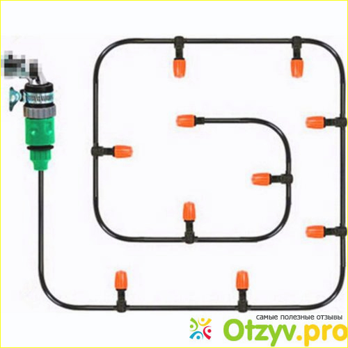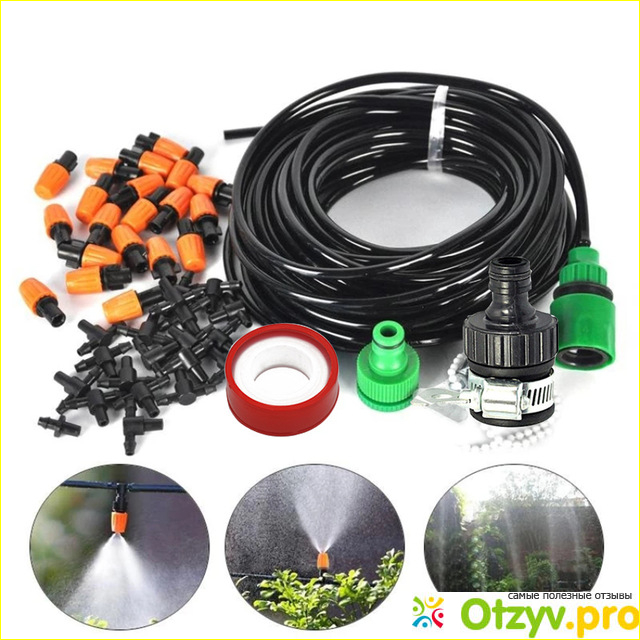 В комплект входит: гибкая трубка распределяющая воду (двадцать пять метров), зелененькие переходнички для подключения к стационарному водопроводу или бочке, которую нужно установить на возвышение до двух метров для создания напора, комплект палочек удерживающих гибкую трубку, набор распылительных форсунок, регулирующих (откручиванием-закручиванием) количества струек воды и тройники соединительные.