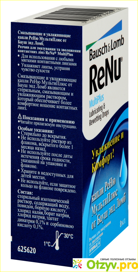 Почитала информацию в интернете, выбрала для себя по отзывам пользователей Капли для глаз Bausch&Lomb ReNu MultiPlus. У них первое и прямое назначение - это применение при использовании контактных линз. Но также можно и капать глаза при переутомлении и сухости.