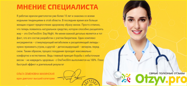 Все женщины, приходящие ко мне на прием, ищут одного - такого средства, которое позволило бы им похудеть легко! И теперь я могу им порекомендовать, наконец-таки, это средство - это недавно изобретенный препарат Onetwoslim.