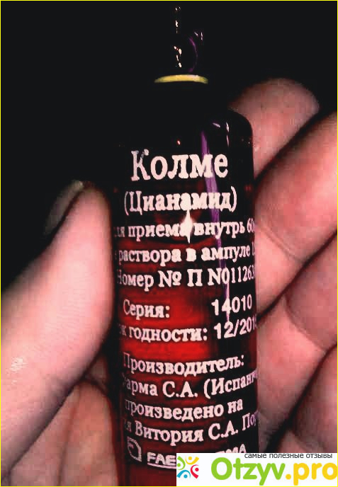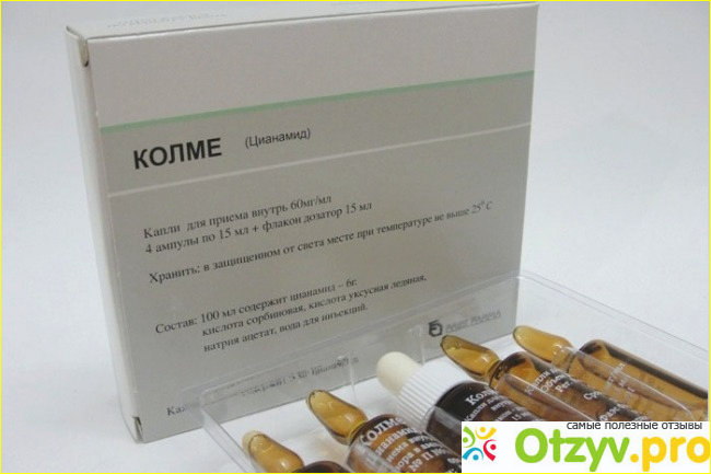 Основное вещество в Колме – это цианамид. Кроме ампул с этим вещество в упаковке имеется и флакон-дозатор.