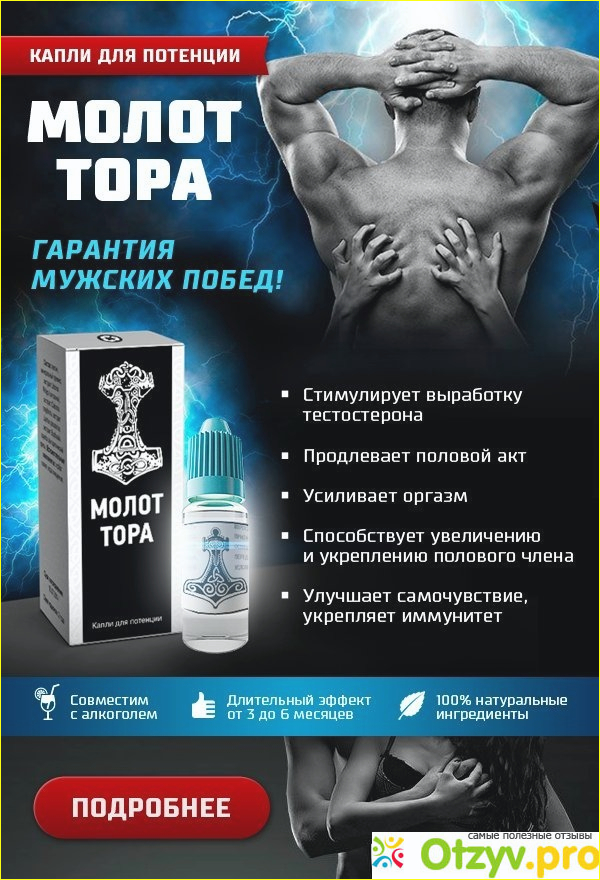 Не секрет, и это мошенникам хорошо известно, что у сильного пола область интимной сферы очень чувствительна. Страдалец распрощается с любыми средствами, только чтобы не оказаться "слабаком". А если узнают друзья? На этом и делается "гениальный" обман мужчин. На что клюют доверчивые заказчики свредств от облысения и от импотенции и так далее и тому подобное? На чем мошенники строят свою аферу? Все очень предсказуемо и банально. Это психологическая игра на проблемах мужского пола. Такая сегодня житуха, что у мужиков все чаще возникают осечки в их самой основной функции. Это или экология шалит, или непрекращающиеся депресняки, но что есть, никуда от этого не денешься. Что делать и куда бежать, кому говорить. Конечно начинают заниматься самолечением сомнительными средствами. Этот товар пузырёк надувают рекламой и, когда потребители выявят обман, эти чудо исчезает из продажи. Почти не важно, как будет называться чудо средство. Может и молот тора, а может и вечный стояк. Но такая схема остается. Вскоре в интернете будут втирать что-нибудь другое. И так же дерзко пиарится и впаривать доверчивым людям. Ингредиенты капель вроде натуральные. Капли питают, насыщают организм витаминами и цинком. Влияние этого состава на потенцию не доказано. Врачи, если они не агенты этой фирмы, не пропишут вам капли Молот Тора. Покупка и применение - ваше дело. Производитель утверждает, что создал капли по рецепту древних скандинавов. Цель – вернуть и усилить потенцию у мужчин. Показаны капли при отсутствующей (слабой, недостаточной) потенции, преждевременной эякуляции, слабой чувствительности, и если угнетенное либидо.