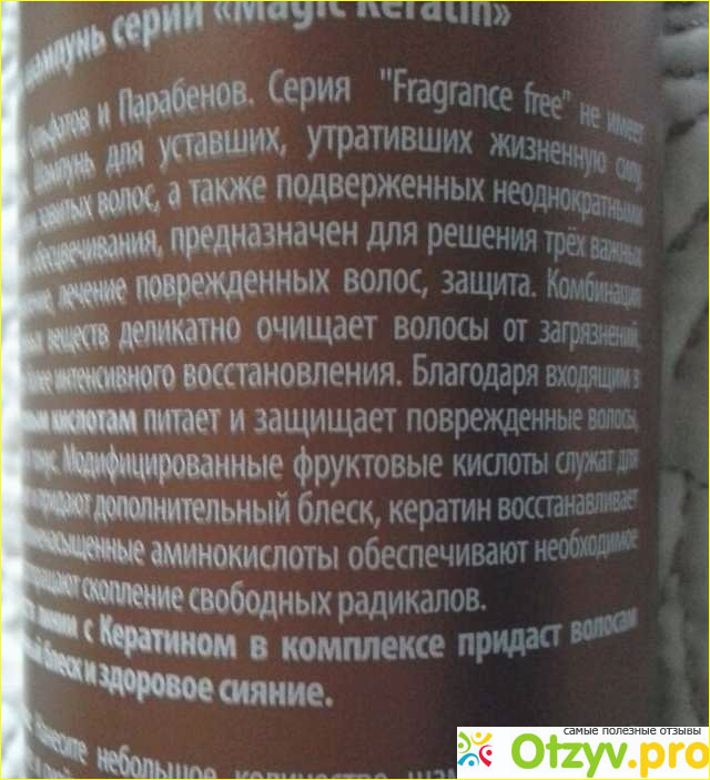 Перепробовав несколько десятков средств для ухода за волосами, я остановилась на марке Kapous, профессиональная линия. Больше доверия, у меня вызывают средства для профессионального использования, все таки парикмахеры разбираются в средствах лучше тех, кто пользуется их услугами. Самым первым был приобретен бальзам для окрашенных волос, с помощью которого, я в течение десяти дней кое-как привела волосы в более или менее приглядный вид, но кожа головы продолжала чесаться и мне посоветовали сменить шампунь. Естественно, я купила шампунь той же марки Kapous кератин, для поврежденных волос. Зуд прекратился после первого же мытья, что сразило меня наповал и вызвало огромную признательность и благодарность производителю. В описании Kapous шампунь кератин, заявлен как состоящий из натуральных компонентов, но все таки в составе я нашла некоторые ненатуральные составляющие, хотя будем надеяться, их количество совсем небольшое. После полуторамесячного применениядва-трираза в неделю, скажу, что средство это действительно помогает лечить и восстанавливать структуру волос и улучшает внешний вид.