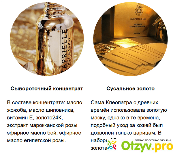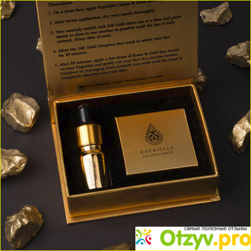 Применение золота в уходе за красотой берет начало со времен Клеопатры. Египетская царица относилась с особой тщательностью к внешности и часто использовала изысканные способы для сохранения свежести и молодости кожи. Применение дорогостоящих компонентов всегда было уделом царственных особ. Женщины обычные не имели возможности и доступа к такому уходу и старение наступало быстрее. Конечно, возрастные изменеия естественный процесс, но есть возможность на время остановить возраст и сегодня, этот способ и средства доступны каждой женщине. В состав маски из сусального золота Kaprielle входит сывороточный концентрат из натуральных масел и травяных экстрактов:
