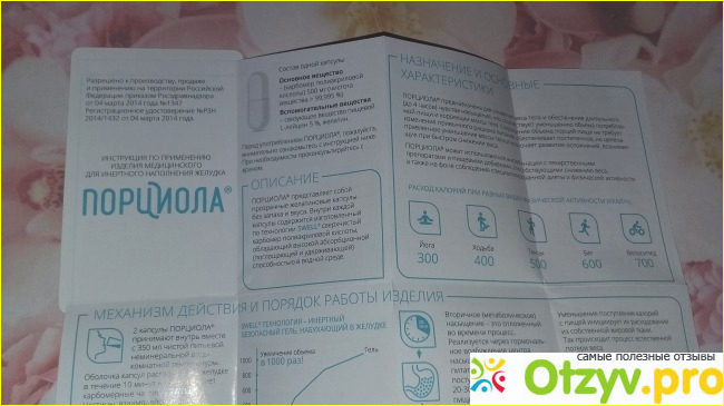 Принцип действия этих капсул в том, что частично заполняя желудок, они не позволяют много съесть. Для этого, нужно выпить две капсулы порциолы и запить большим стаканом воды.