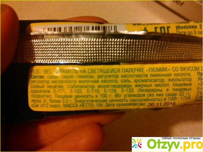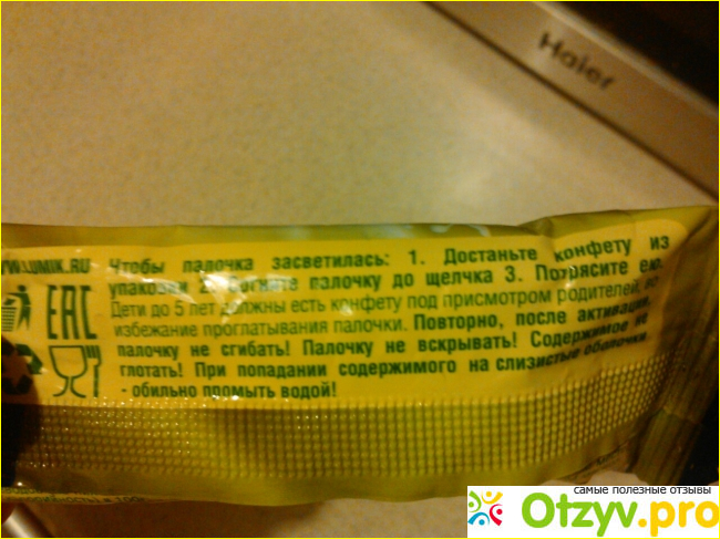 Нужно переломить палочку до щелчка и потрясти ей или ударить обо что-то. Сын, конечно, скорее всё это сделал и палочка действительно засветилась. Такие люминесцентные палочки ещё продаются в рыбацких магазинах и товарах для праздника, из них делают браслетики и т. д. Вкус у леденца яркий, сильный, на фото леденец со вкусом дыни, запах у него очень сильный, дынный.