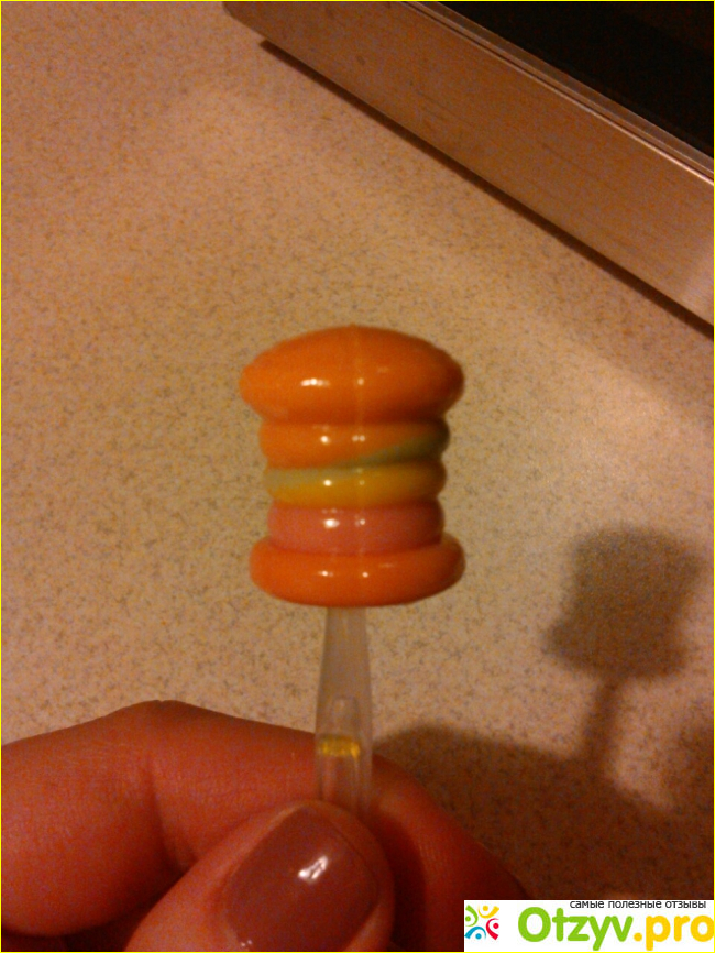 В яркой упаковке находится леденец интересной формы, такую я ещё не видела, и самое интересное, что палочка, на которую он надет, должна светиться, если с ней проделать нехитрые манипуляции.