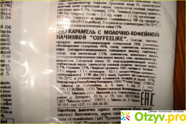Коричневая карамельная оболочка конфеты настолько твердая, что понадобится второй ряд зубов, чтобы ее разгрызть. Я подумала, что конфеты залежались на полке. Но нет, конфеты были свежие. Очень сладкая, приторная, липнет к зубам. Не весело. Начинка оказалась получше. В ней чувствовался кофейный вкус, но не сильно выраженный (как я ожидала). И добил меня состав конфет. Это сплошное пальмовое масло.