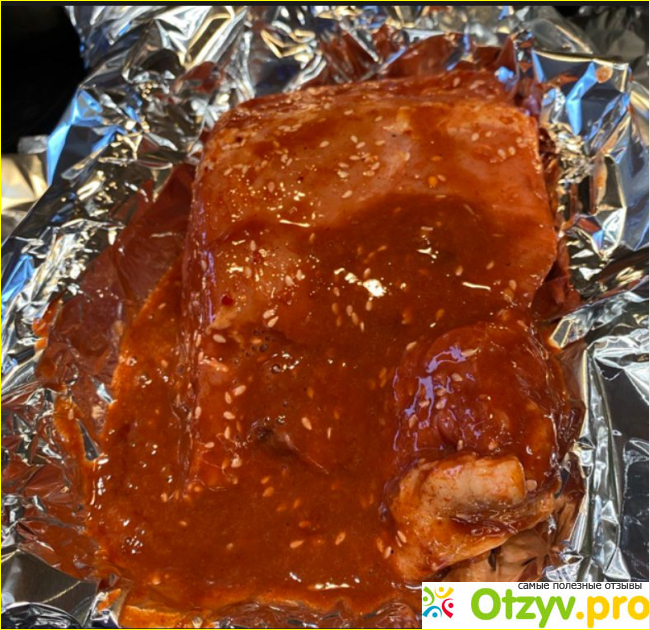 Упаковка крепкая, прочная, ничего лишнего не попадает. Готовиться легко, а на упаковке написан состав, что мне, конечно, нравится. На вкус выходит немного кисленькая, а моим очень нравится, что сверху еще и посыпано семечками кунжута. Я — тоже мясом довольна, советую попробовать, отличное блюдо к празднику! Можно и просто на ужин такой запекать, как вариант.