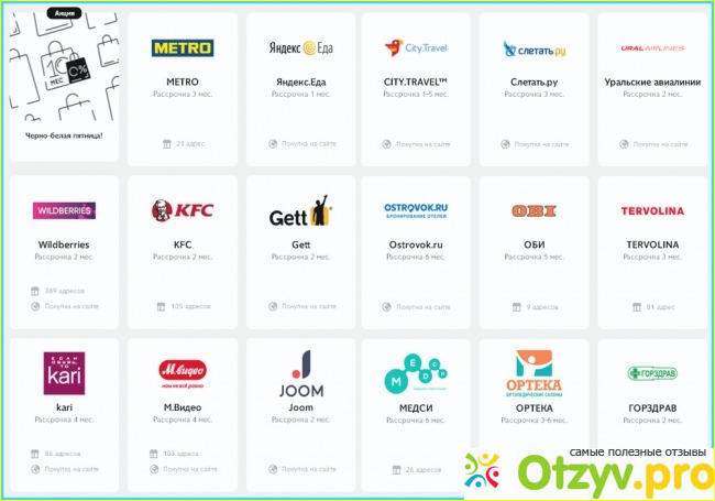 Но сперва я предлагаю определиться с самой картой - что она из себя представляет, как ею правильно пользоваться и какие преимущества доступны обычному человеку, если он решит присоединиться к проекту? Предельно подробная инструкция ожидает вас в разделе "Как пользоваться". Первым делом объясняется, как осуществить оформление - где заказать и получить, что предпринять для активизации. Сразу после этого карточкой можно расплачиваться у партнёров, представленных в огромном списке. У каждого из них свои сроки рассрочки платежа - один или два, три или более месяцев. Но прежде всего я бы советовал разобраться с правилами определения сумм ежемесячных платежей, чтобы потом по ошибке не допустить просрочки.