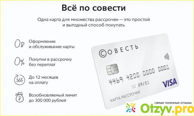 Рекомендовать карту "Совесть" я буду, но действовать нужно с умом. Иногда подобная карта - это единственная возможность приобрети необходимый товар, не прибегая к заемным средствам. Очень внимательно читать все условия, ни в коем случае не забывать вовремя отдавать потраченные деньги, иначе рискуете вместо рассрочки получить дорогущий кредит.
