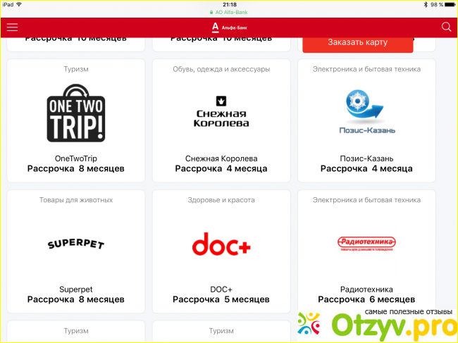 Срок рассрочки у партнеров банка по карте ВМЕСТО ДЕНЕГ от Альфабанка от 0 дней до 24 месяцев. Через партеров выгодно приобретать технику, электронику или мебель, так как такого срока рассрочки вполне достаточно для погашения кредитного займа.