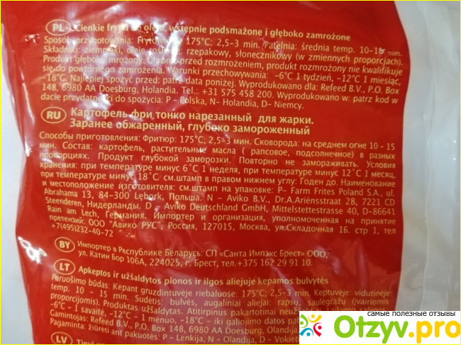 Упаковка мне понравилась. Яркая, завлекающая, не потеряется в общей массе другой продукции. По-русски на лицевой части пачки написано только, что это «картофель фри тонко нарезанный».