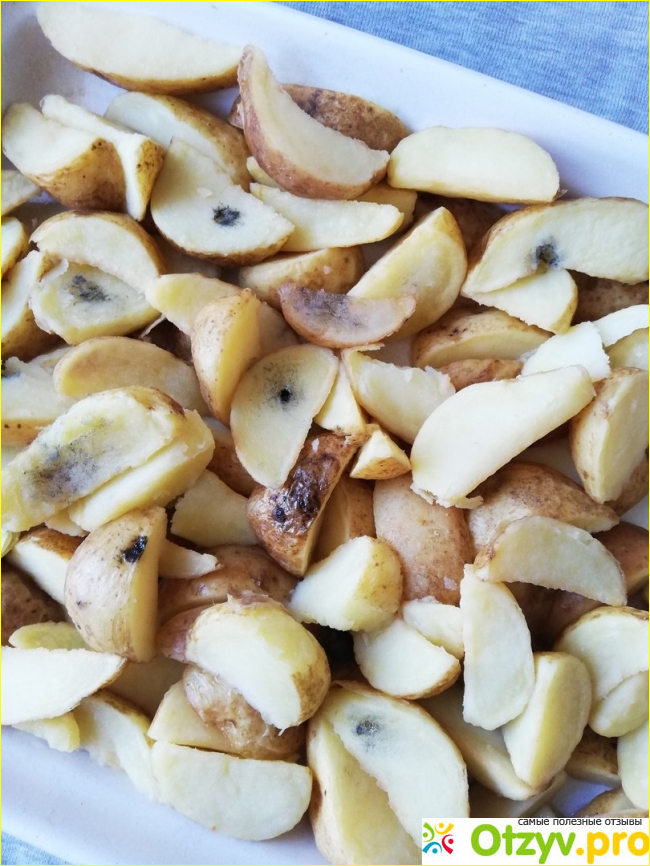 Выложив содержимое упаковки на блюдо для запекания, я потеряла дар речи, такого ужаса в покупных замороженных продуктах мне еще не доводилось встречать! Картошка оказалась испорченная, вся с синюшными пятнами, червоточинами, некоторые дольки даже скользкие.