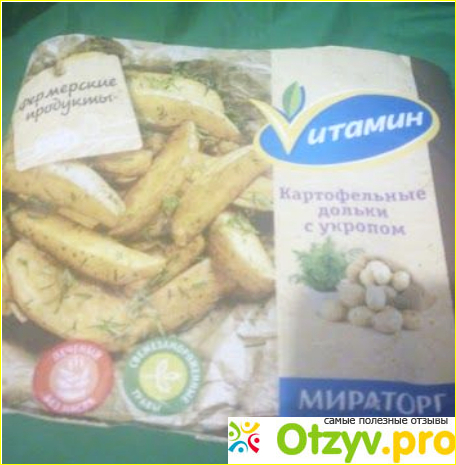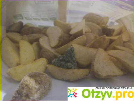 Внутри упаковки лежили картофельные дольки без укропа. Его я обнаружила в середине пачки в виде глыбы льда зеленого цвета. Не очень удобно в том случае, если вы планируете отправлять ломтики во фритюр или духовку. В этом случае придется размораживать укроп отдельно. Я жарила на сковородке, но все равно не впечатлилась результатом. Укроп оказался порубленным странным образом. Попадались очень длинные его фрагменты, которые выглядели не слишком красиво. А еще мне не понравилось то, что картофель был каким-то водянистым. Кстати, при приготовлении слипшийся в процессе заморозки укроп распределился по долькам неравномерно. Возникли сомнения по поводу того, что подготовка к заморозке производилась правильно. Продукт я не рекомендую. В этой ценовой категории можно выбрать что-то получше.