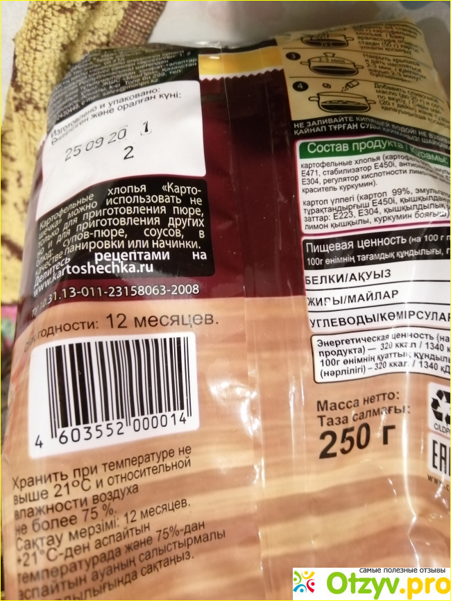 В такой пачке находится 250 грамм сухих картофельных хлопьев. Много ли это или мало – скажет обыватель, сидя на диване. На пачке написано на 10 порций. Да ладно, это они так шутят. Для двух-трёхлетнего ребенка да может быть и можно смолотить 10 порций, но для нормального взрослого человека этого порошка будет очень мало.