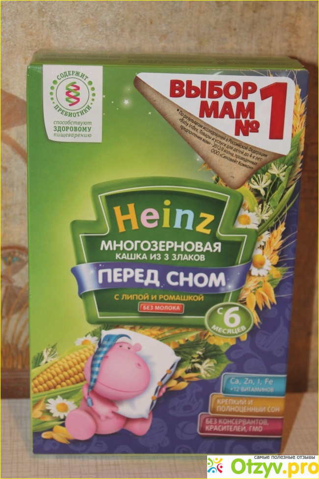 Данная многозерновая кашка от Хайнц содержит в себе три злака - овсянку, пшеницу и кукурузу. Кроме того, в нее добавлены так сказать успокаивающие травы, видимо, для лучшего сна малыша - цикорий в виде мелких волокон, липа и ромашка. Кроме того производитель обещает, что здесь содержатся определенные микроэлементы и витамины, способствующие росту и нормальному развитию вашего ребенка. Данная каша хороша еще и тем, что в ней не имеется таких вредных добавок как красители, ароматизаторы, пальмовое масло, сахар, загустители и тому подобные вещества, которыми изобилует пища для нас, взрослых людей. То есть можно сказать, что состав здесь экологически чистый. Что же касается молока, то его здесь нет, да и с травами, как мне кажется, молоко бы плохо сочеталось.