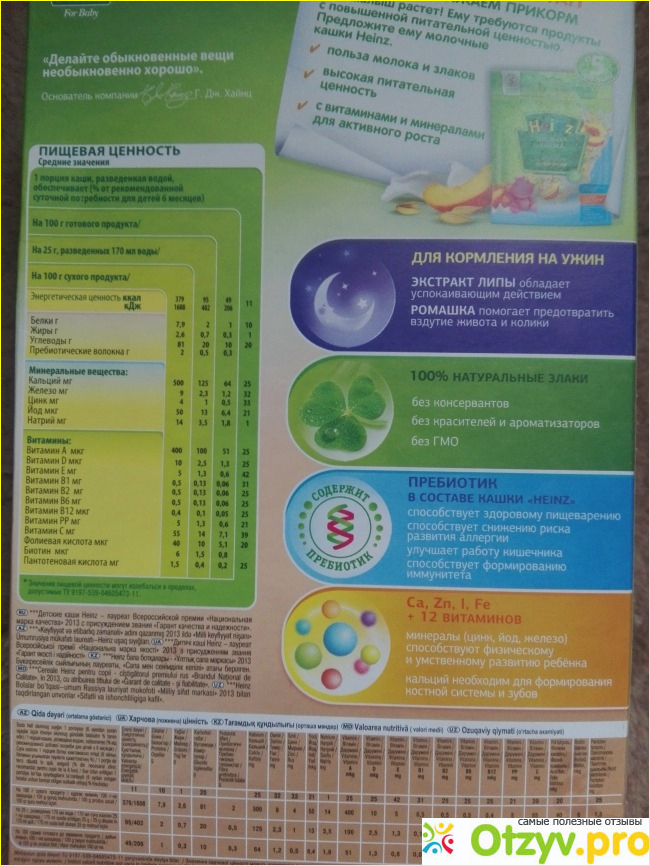 Как обычно эта фирма меня не разочаровала, каша не плохая, разводиться хорошо, сладкая по вкусу, так как в составе есть сахар. Каша разрешена деткам с 6 месяцев, на мой взгляд , это еще рано, так как здесь три крупы собраны, и еще два экстракта растительных, надо чтобы ребенок хотя бы крыпы попробовал по отдельности , проверить нет ли аллергических реакций на что-либо.