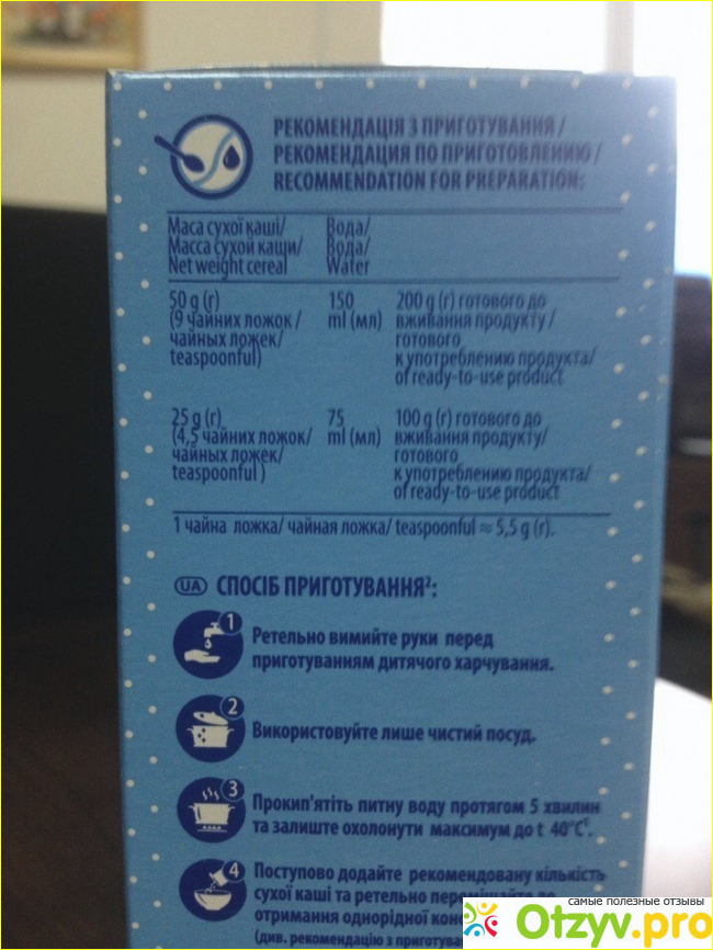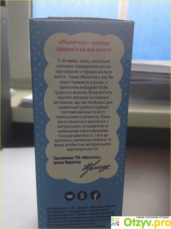 Хочу сразу предупрелить, что кашка эта молочная, поэтому внимательно ее давайте деткам, которые не переносят лактозу или вообще имеют на нее аллергию. У нас с этим все в порядке, поэтому эту кашку купила на пробу. И не пожалела. В состав каши входят 5 злаков - пшеница, курурузная, овсяная, ржаная, рисовая), она обогащена витаминка. Что особенно меня порадовало, что в ней нет сахара и соли, зато есть кучу полезных микроэлементов и витаминов. Еще порадовало как маму, что там есть милое обращение создательницы бренда