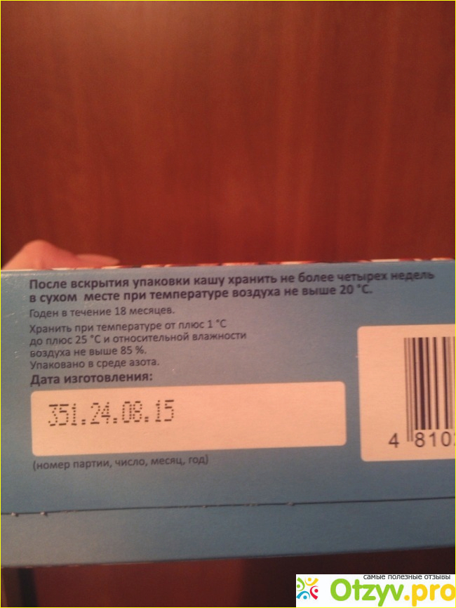 Помимо коробки, каша герметично упакована в плотный пакет из фольги. Хранить кашу можно в запечатанном виде в течение полутора лет, а если открыть пакет с кашей, то её нужно скушать за месяц максимум. Про всё это написано на донышке коробки. Здесь есть также информация о дате изготовления продукта.