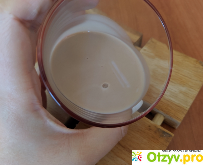 Кашка не сказать, что густая, но и не жидкая без комочков, переливается без труда. Легко пьется благодаря этому через обычную трубочку от сока.