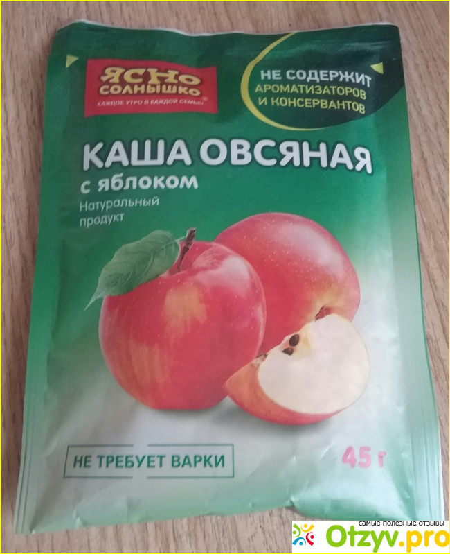 Меня устраивало то, что каша не требовала варки. Кашу купила на всякий случай, если вдруг захочется в дороге, так как ехать нам поездом 2 суток, да еще с пересадкой. Стоимость одного пакетика каши овсяной примерно около 8 рублей. В пакетике расфасовано 45 грамм овсяных хлопьев, не требующих варки, сахара, кусочков яблок сушеных и соли. Как видим состав очень хороший, простой и натуральный. На упаковке производителем указано, что данный продукт не содержит в своем составе никаких ароматизаторов и консервантов. Мне этот факт очень понравился. На пакетике изображены очень симпатичные и аппетитные 2 яблока красного цвета, а рядом - одна четвертинка яблока. Всего в пакетике расфасовано 45 грамм сухого продукта, которого вполне хватает, чтобы покушать.