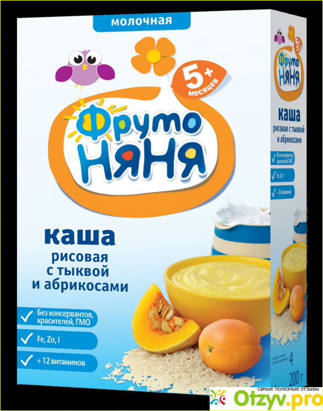 С задней стороны картонной упаковки с кашей рисовой с тыквой и абрикосом от ФРУТОНЯНИ много полезной и интересной информации.