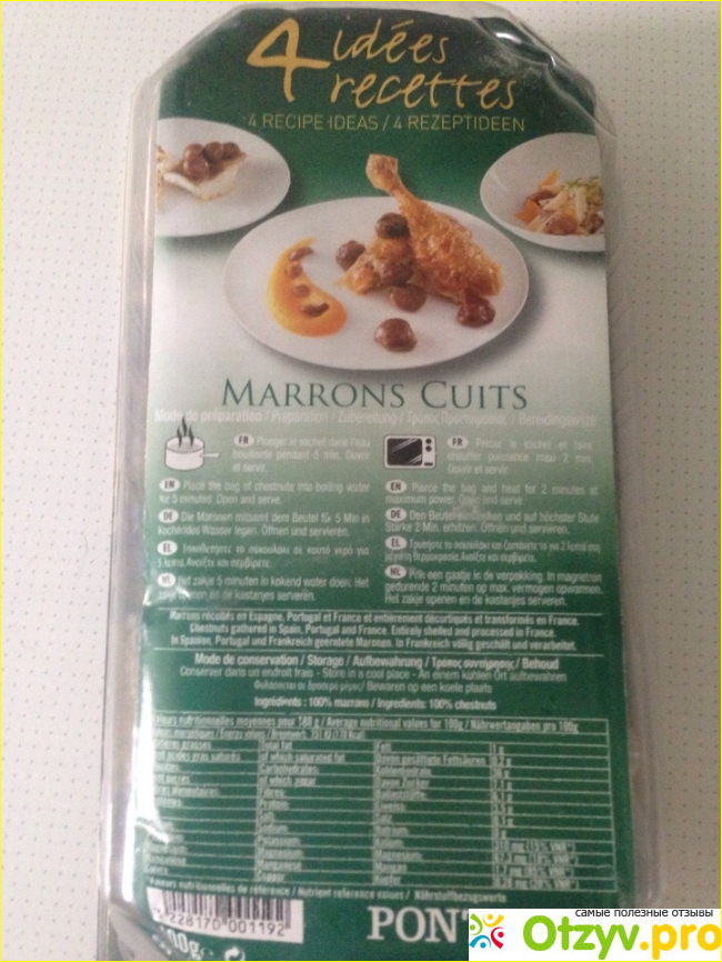 Если же говорить о готовой продукции, для дегустации я советую брать каштаны в вакуумной упаковке, сохраняющие текстуру, вкус и свежесть. Например, могу порекомендовать мои любимые, французской марки Marrons Cuits . Общий вес- 400 грамм, разделен на две упаковки по 200 грамм, для удобства употребления и хранения.
