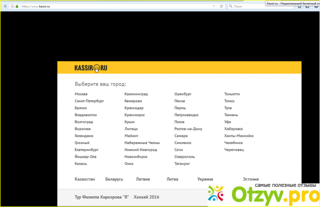 Начнем с того, что сайт функционирует в нескольких городах России, поэтому, когда вы заходите на него система предлагает выбрать вам подходящий город. И не только город, но и другую республику, страну. Например, среди вариантов есть Казахстан, Литва, Эстония, Украина и другие. Работает Кассир. ру и в таких городах как Москва, Санкт-Петербург, Крым, Липецк и другие. На фото видно все более подробно.