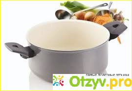 Изготовлена кастрюля из высококачественных материалов, снаружи она имеет алюминиево основание, которое сверху имеет керамическую эмаль, внутри так же покрыто керамическим покрытием, которое славится своей долговечностью, оно устойчиво к царапинам, не подвергается коррозии, не стирается, не распадается при высоких температурах и даже если ее случайно уронить, то покрытие не должно откалываться, сверху кстати есть еще и антипригарное покрытие. Оно действительно отличное, но многие жалуются, что оно сдирается, так вот у моей кастрюли все отлично, покрытие как новенькое, хоть пользуюсь уже кастрюлей более 2-х лет. Я в ней часто готовлю, но при мытье не использую дерущих средств, чтоб лишний раз все же не повредить покрытие.