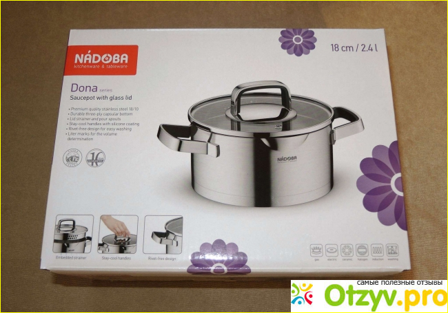 Я решила выбрать кастрюлю Nadoba Dona объёмом 2,4 л. Диаметр этой кастрюли – 18 см. Кастрюля замечательная: тяжёленькая и красивая. Её не стыдно кому-нибудь подарить.
