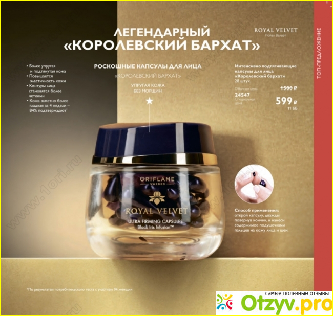 Следующий легендарный продукт, входящий в акцию по скидке - капсулы для лица - Королевский бархат. Это - 28 интенсивно подтягивающих капсул с маслом. Это одни из первых капсул, появившихся на страницах первых каталогов Орифлейм. Они не имеют в своем составе консервантов, потому что все цельные ингредиенты запакованы в капсулы.