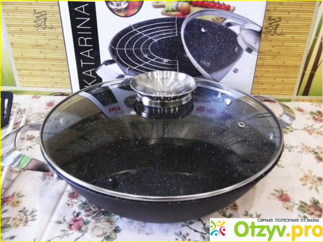 Казан на 5 литров или что-то около этого. Со стеклянной крышкой, очень легкий. Есть решетка, только вот для каких целей, я не смогла понять. В придачу пластиковая лопатка и две палочки. Я так предполагаю, что рис есть, или чтобы антипригарное покрытие не поцарапать. Вот он красавчик.