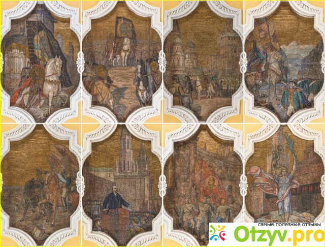 Из Казанского вокзала можно попасть на красную Сокольническую линию и перейти на кольцевую. Станция метро Комсомольская-кольцевая - это шедевр сталинской архитектуры с мозаиками художника Павла Корина, посвященными победам русского оружия - Дмитрия Донского, Александра Невского и других. Станция была создана как ворота Москвы и призвана производить впечатление на гостей столицы. Корин получил сталинскую премию за свою работу по украшению станции.