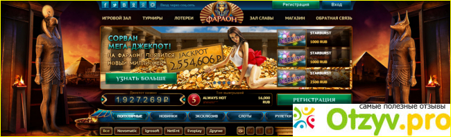 Казино Фараон, одно время входило в топ надежных казино онлайн. Многие сайты которые занимаются мониторингом подобных сервисов, вносили казино в свои списки. Но даже это казино не дает возможности нормально зарабатывать. Да, они выведут вам деньги. И это факт. Но большие суммы отсюда вынести вам не позволят. Это не выгодно, совершенно не нужно сайту. Как бы не утверждалась надежность сайта, могу сказать о его падении. Считаю, этот сайт уже сдулся. Играть там не рекомендую. Тем более на мелкие суммы денег. В любом случаи потеряете свои средства. Вернуть не получится, проиграли сами. К сожалению такова реальность. Какие бы красивые сайты не светили, какие бы бонусы там не раздавали, вы всегда будете рисковать потерять те суммы которые вкладываете. И не важно какой бонус вам дадут. Любой бонус ловушка. Его нужно будет отбить. Вы внесете сто баксов, вам дадут пятьдесят бонусом. И эти деньги вам будет предложено отыграть, тут вы и теряете свои сто. Такова система.