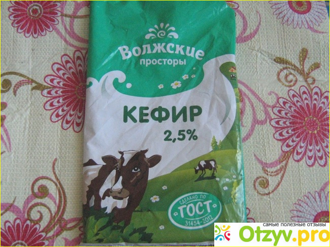 Пьется кефир легко. Данный кефир "Волжские просторы" изготовлен из нормализованного коровьего молока и закваски, приготовленной на кефирных грибках. Кефир находится в мягком пакете (Finnpak Nova), в котором 900 грамм. Кефир с массовой долей жира 2,5%.