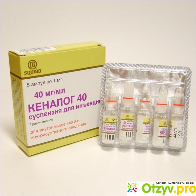 Кеналог также принадлежит к категории глюкокортикостероидам, действующим веществом является триамцинолон в дозировке по 40 мг.