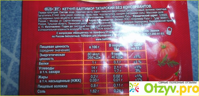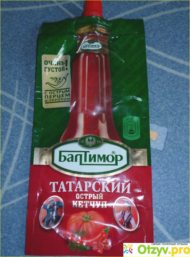 Оформлена упаковка кетчупа Балтимор "Татарского" любопытно, на упаковке изображена бутылка, я сначала не поняла для чего она тут изображена, а потом на оборотной стороне прочитала, что в данной таре кетчуп такой же, как и в бутылке, теперь понятно почему она здесь изображена.