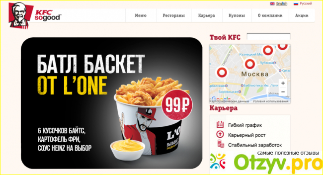 Рассмотрим более подробно из сайт. Он ориентирован прежде всего на потребителя. можно посмотреть полное меню. очень удобно. что он сразу с ценами, в отличие от того же "Бургер кинга". Так что перед походом в это кафе можно заранее выбрать у них на сайте, что будешь заказывать, чтобы потом не тупить на кассе. Также на их сайте есть всякие акции и скидки и можно скачать купоны (в распечатанном виде или на свой смартфон, например в их приложении), показав которые кассиру можно получить любимые блюда с ощутимой скидкой. Например недавно, там была очень выгодная акция на Баскет Дуэт, который стоит 399 рублей, по купону же со скидкой он был всего лишь за 149 р. Единственное. что плохо что у них нет системы долива напитков, как в том же "Бургере" и выпив свою газировку приходиться покупать еще и вторую, если не напился.