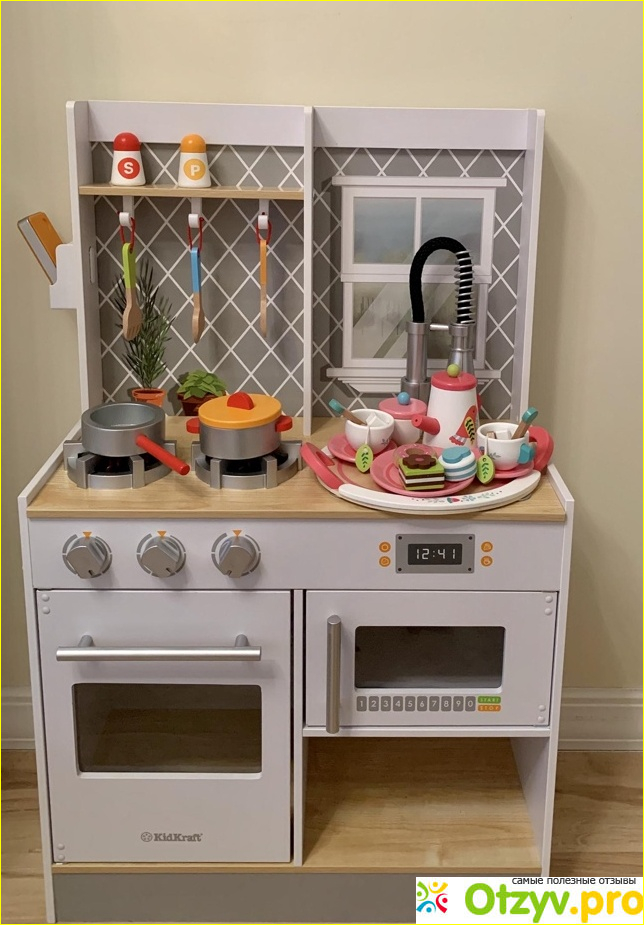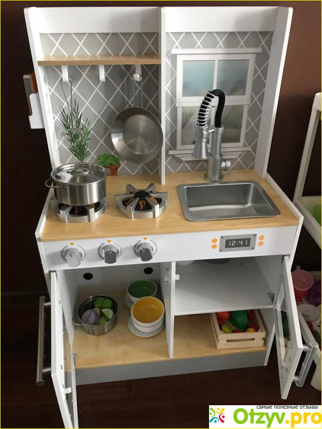 Это дорогостоящее приобретение обошлось по акции в 16000 рублей. Изделие предназначено для детей старше трех лет. Изготовлено из МДФ. Представляет собой мини версию кухни с раковиной и смесителем, газовой плитой, микроволновкой и полочками для хранения посуды. Есть панель для отсчета времени приготовления блюд. Все очень реалистично, натурально, и это настоящая мечта для маленького повара, который будет королем в своей собственной кухоньке.
