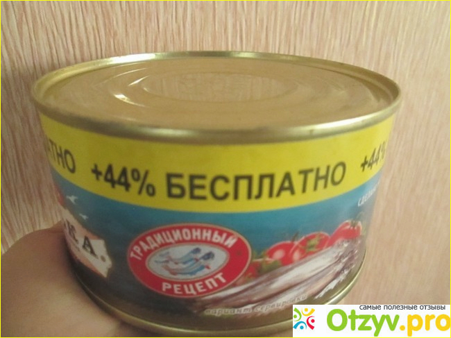До лета сего года мне килька в томатном соусе попадалась только в плоских и высоких банках по 220-250 грамм весом, однако, недавно нашел в паре торговых центров вроде "Окей" кильку в томатном соусе в банке весом 350 грамм. На ней сверху странная надпись +44% бесплатно. на самом деле не так уж и бесплатно.