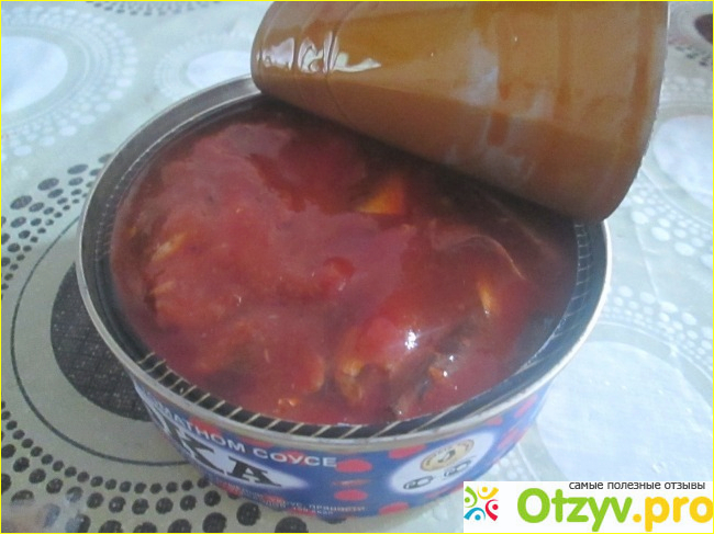 Открыл - содержимое. Соус нормальный, рыбка нормальный размеров, годится как добавка к гарниру, с макаронами ушла с первого раза