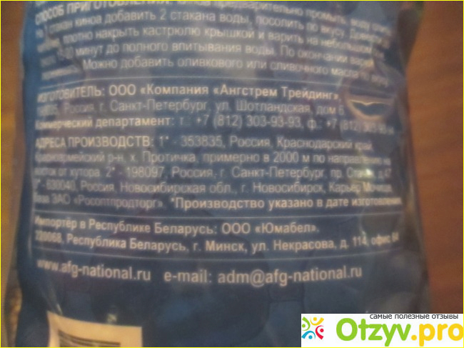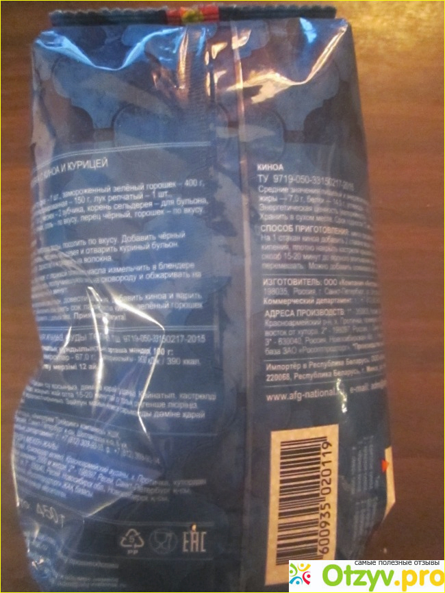 Сама крупа из Перу, но там мелким шрифтом еще несколько соседних стран были указаны , таких как Боливия и Аргентина. Расфасовали в России , аж два адреса, там же фасуют рис и фасоль.